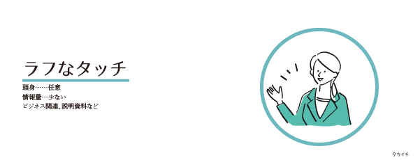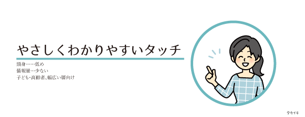 やさしくわかりやすいタッチは5頭身前後の柔らかい雰囲気。書き込む情報量が少なく簡単でわかりやすい説明になります。 幅広い層に向けたタッチです。